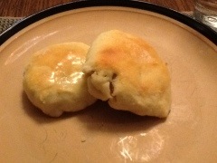 Preheat oven to 375*. Thoroughly wet your hands in an effort to keep dough from sticking to you- it will be very sticky! Prepare a silicone mat with a dusting of rice flour. Divide dough into 10 equal balls or grab one small handful of dough to start. Flatten the dough ball, using only your hands and flipping to keep rice flour coating even around all of the dough. Once it is flattened evenly into a roughly 4 inch circle, add a pinch of cheese to the center and top with 3 Tbsp of filling. Pull the sides up, careful not to tear holes, until the filling is completely enclosed. Then place it seam down into a greased 9×13 glass pan. Repeat until all 10 burgers are complete- re-flouring the mat frequently. Brush the top of each each burger with butter.