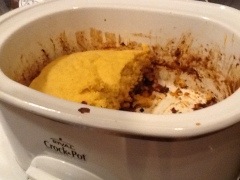 An hour before you are ready to eat, mix the cornbread together in a separate bowl- according to package directions. Pour the batter on top of the meat mixture in the crockpot. Continue to cook on low for 1 more hour or until a knife comes out of the cornbread clean.