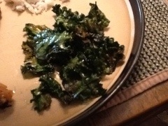 Break kale leaves into chip sizes and place in a bowl. Drizzle with olive oil and toss to coat. Add seasoning and toss to distribute evenly. Lay out in a single layer on a thin cookie sheet. Bake at 350* for 10-15 minutes or until crisp.