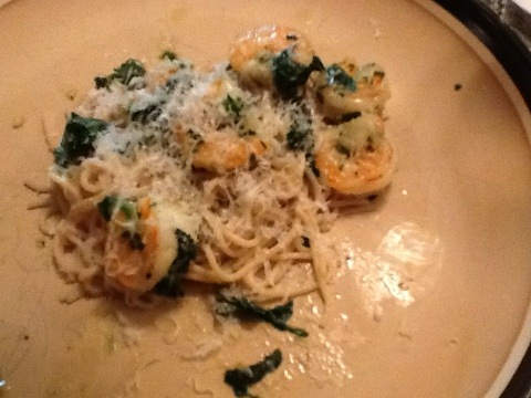 Over medium-high heat, roast garlic in olive oil. When garlic is starting to turn light brown, add the shrimp and spinach. Sprinkle the seasonings over the shrimp and stir to coat evenly. Cook on medium, flipping shrimp 1/2 through, for 5-7 minutes or until all shrimp are pink.