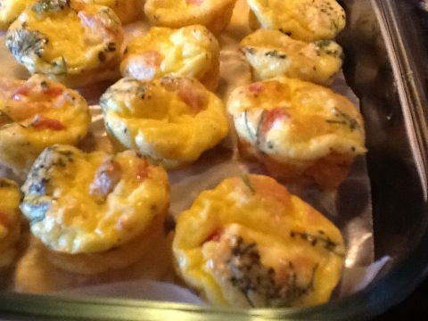 Whisk together eggs, milk, salt, and pepper. Then, add remaining ingredients. Generously coat 2 mini muffin tins with GF non-stick cooking spray. Fill each cup 3/4 full. Bake each tray for 15 minutes or until egg is set and frittatas have puffed. Continue until egg mixture is gone- making sure to reapply cooking spray between batches. Makes about 35-40 bites.