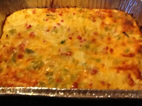 Grease a 9×13 pan and then spread out potatoes evenly. Top potatoes with cheese, ham, green chillies, and onions. In a bowl, mix together remaining ingredients and then pour over casserole. Bake uncovered for 45 minutes or until set and slightly browned.