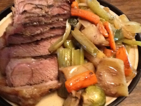 Slice roast 1/4 inch or thinner to serve. With veggies alongside. Make gravy and Yorkshire Pudding out of pan drippings and liquid if desired.