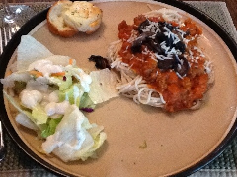 Sautéed mushrooms added a depth and richness to the marinara. We layered the mushrooms on top of the marinara to give more control in which bites had mushrooms. The spaghetti was served with salad and Kraft Ranch dressing and GF Dinner Rolls.