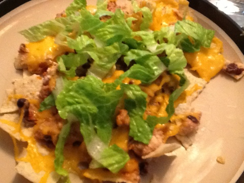 Add the yogurt. Allow to heat through. Then, lay out chips on a cookie sheet. Top with chicken mixture and the cheese. Bake at 350* for 7-10 minutes until cheese is melted.
