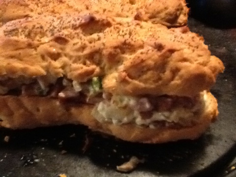 In a sauce pan, brown sausage with onions and green pepper. When sausage is no longer pink, add cream cheese. Cook over medium heat until cream cheese “melts” into sausage mixture. Slice bread in half horizontally, and then spoon meat mixture into between bread halves. If the bread was not warm to start with, cover in foil and heat at 425* until heated through- about 20 minutes. If the bread is fresh from the oven, no need to heat through.